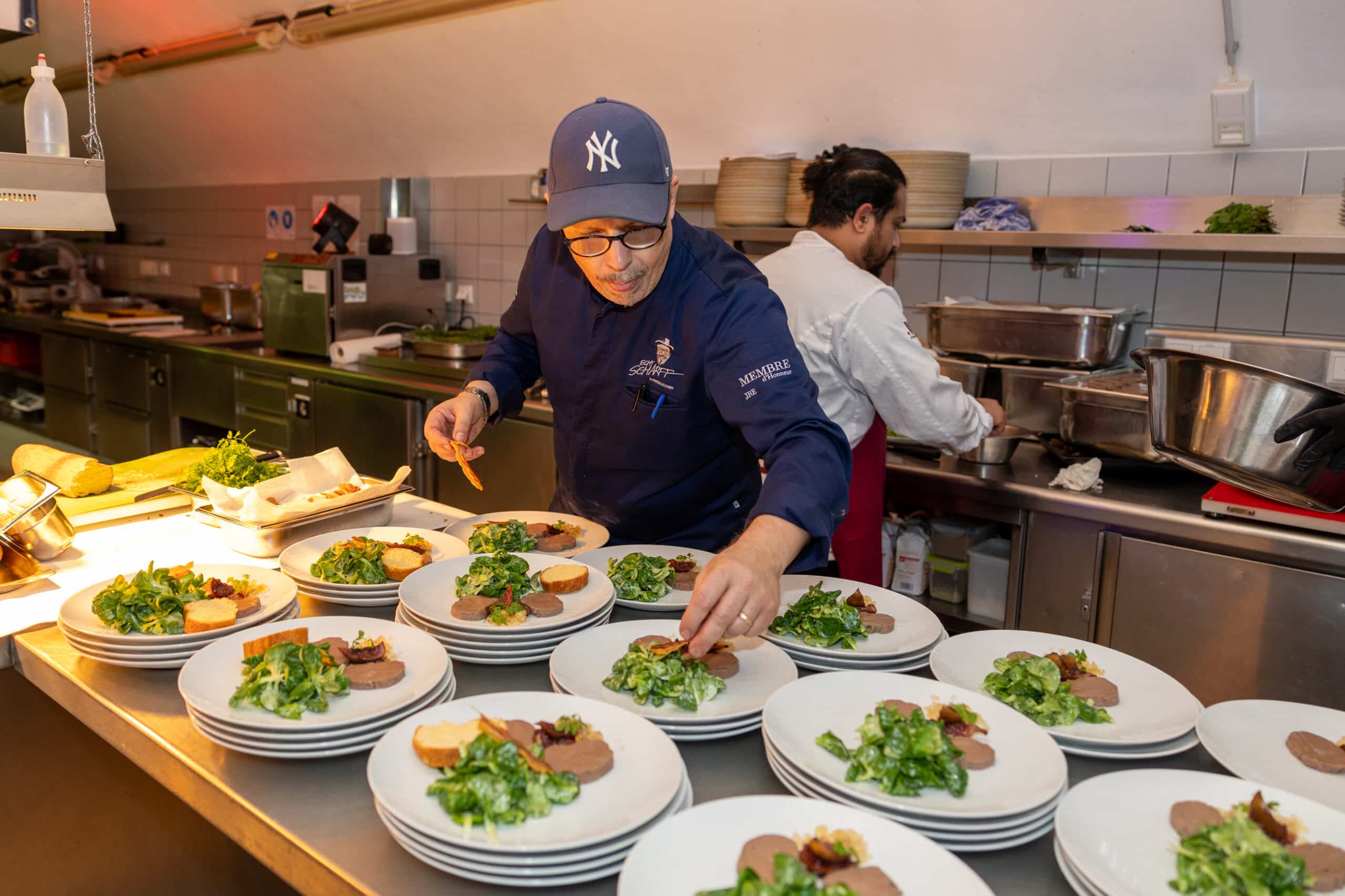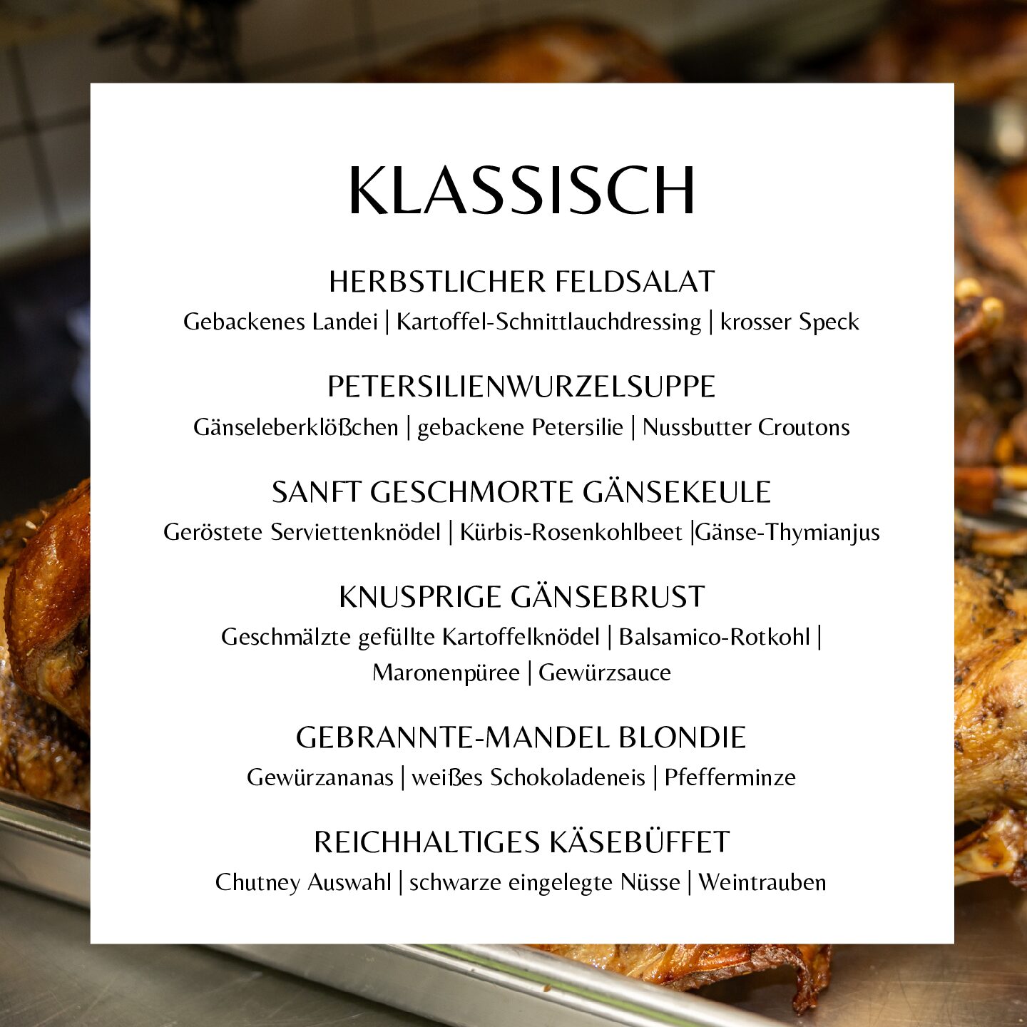 Freuen Sie sich auf die Heidelberger Bauerngans mit knuspriger Haut, saftigen Keulen, würzigem Rotkraut und kreativen Gängen – unsere Gänse stammen von unserem langjährigen und vertrauenswürdigen Partner Geflügelhof Ehrler. Auch vegetarische Optionen sind verfügbar.