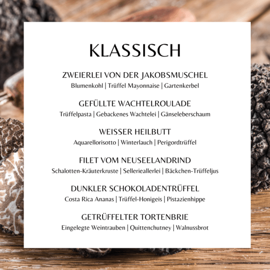 • 6 kreative Fine-Dining-Gänge mit handverlesenem schwarzem Wintertrüffel von Mario Narcisi